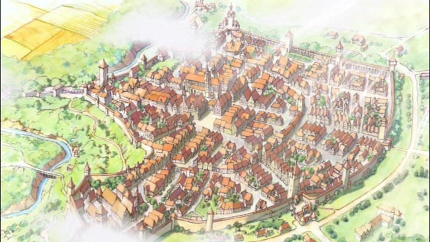 Muhlenberg (ミューレンブルグ一, myurenburugu) (or Muhlenburg) is the fictional town where the series is set. It is a small and comfortable European town, surrounded by rivers, forests, and fields. It is based on the real German town, Rothernburg ob der Tauber.